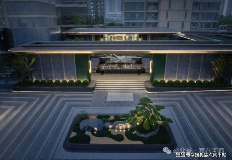 大门中轴的跌水幕布流淌在黑天然石材之上,就像跌落玉盘的珍珠项链。