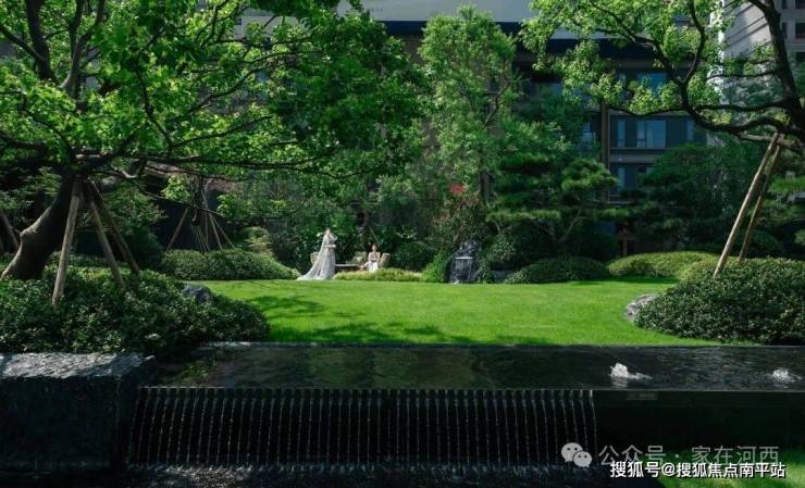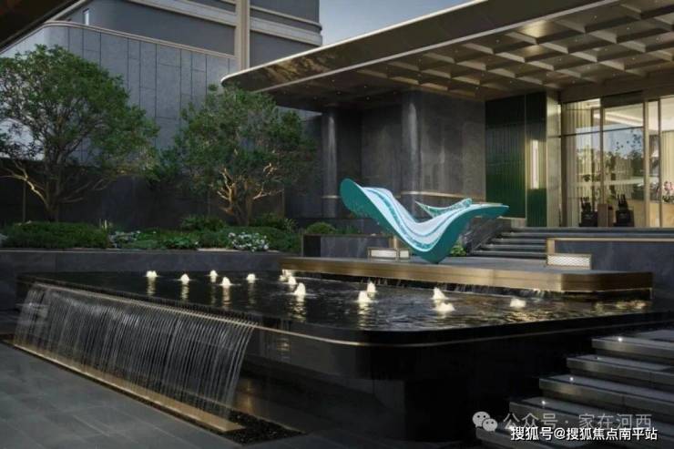 水景中央矗立着一尊飘逸灵动的江水雕塑,碧玉般的颜色十分吸睛。