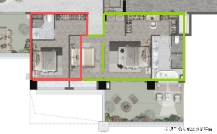 2、主卧套间面积做到差不多35㎡,配备步入式衣帽间、超大卫生间(带双台盆、浴缸、独立淋浴区),堪比高端酒店总统套房,同时奇数层的主卧直接连接空中庭院,尊享感拉满;