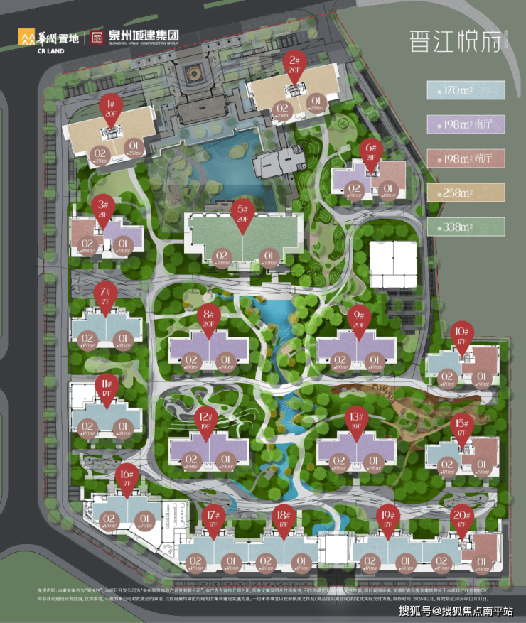 3、项目在住宅部分一共规划18栋17-21层的高层,一共616套,面积段在170-338㎡,主打全四代空中墅,其中又以170㎡和198㎡占比最多,一栋20层的338㎡占据小区中心楼王位置,2栋20层的258㎡在最北侧看晋阳湖,没有一套小户型,圈层纯粹性拉满。
