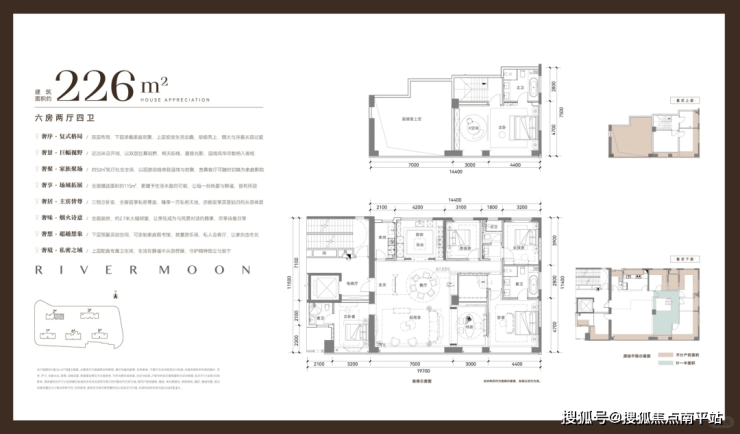 樾宸|226㎡六房两厅四卫复式跃墅 :作为项目的旗舰户型,以复式格局实现动静分区,奢配独立电梯厅,最高赠送面积可达约68㎡,以极致尺度诠释顶豪生活。