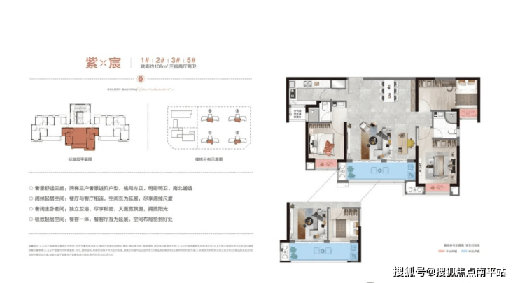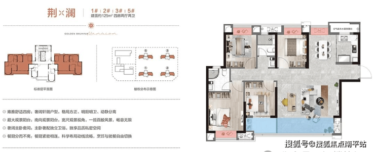 格局方正,空间利用率较高;餐客一体连接南向阳台,空间通透;客厅面宽 5.2 米,可根据需求增改为 3+1 房;主卧配备独立卫浴,各卧室均有南向观景飘窗,采光和观景条件较好;采用两梯三户设计。