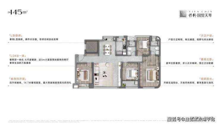 建面约145㎡的4房2厅2卫户型,不仅配置均等,且空间均衡,更能满足三代同堂的居住要求。