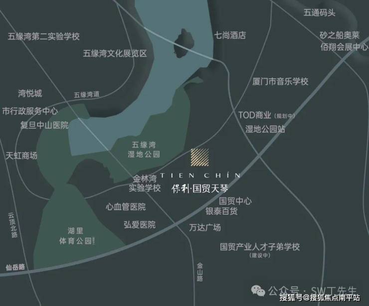 项目以中央绿轴为链接点, 向北延伸可联通五缘湾湿地公园。同时,业主一出门就可穿梭在 应有尽有的街区中,满足吃喝玩乐购的高端多元化生活体验。