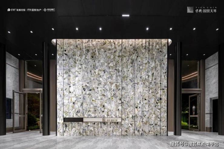 入口处主背景墙采用 冷翡翠天然大理石,一眼便就定了项目的品质基调以及尊崇的归家体验。同时搭配弧形造型,内嵌不锈钢,造价超百万级别。
