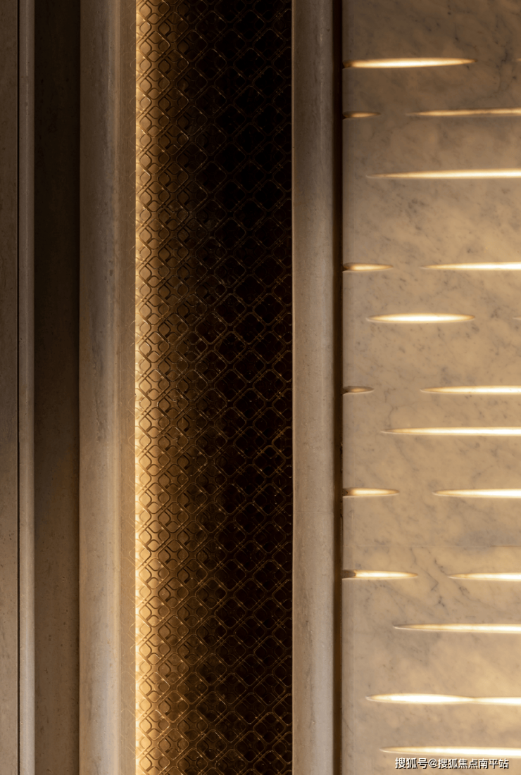 “九天银河入凡尘”,泉瀑院作为迎宾首景,将蓝翡翠制作为拉槽面自然跌瀑,水自上而下缓缓坠入瀑池,珍稀亚马逊蓝石材于光影中流转璀璨,每一道纹理都诉说着非凡的品质追求。