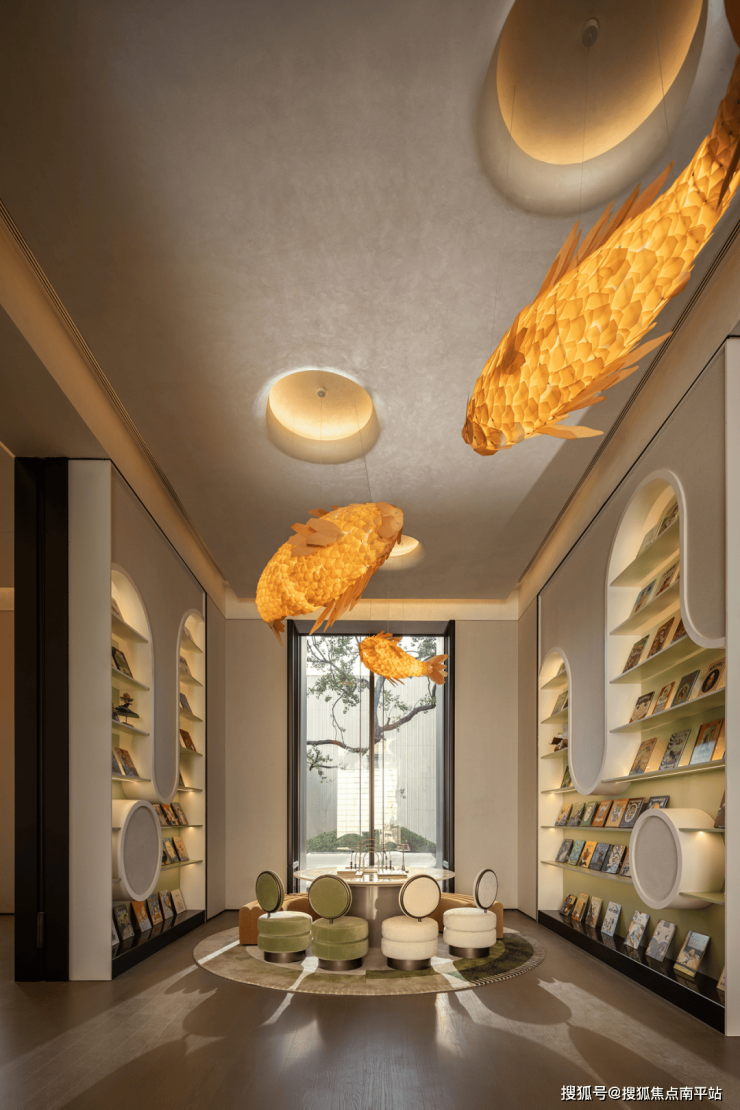 设计师以"鱼跃龙门"为灵感,通过流动的造型与灯光设计,营造出一个充满想象力与自然气息的阅读天地。