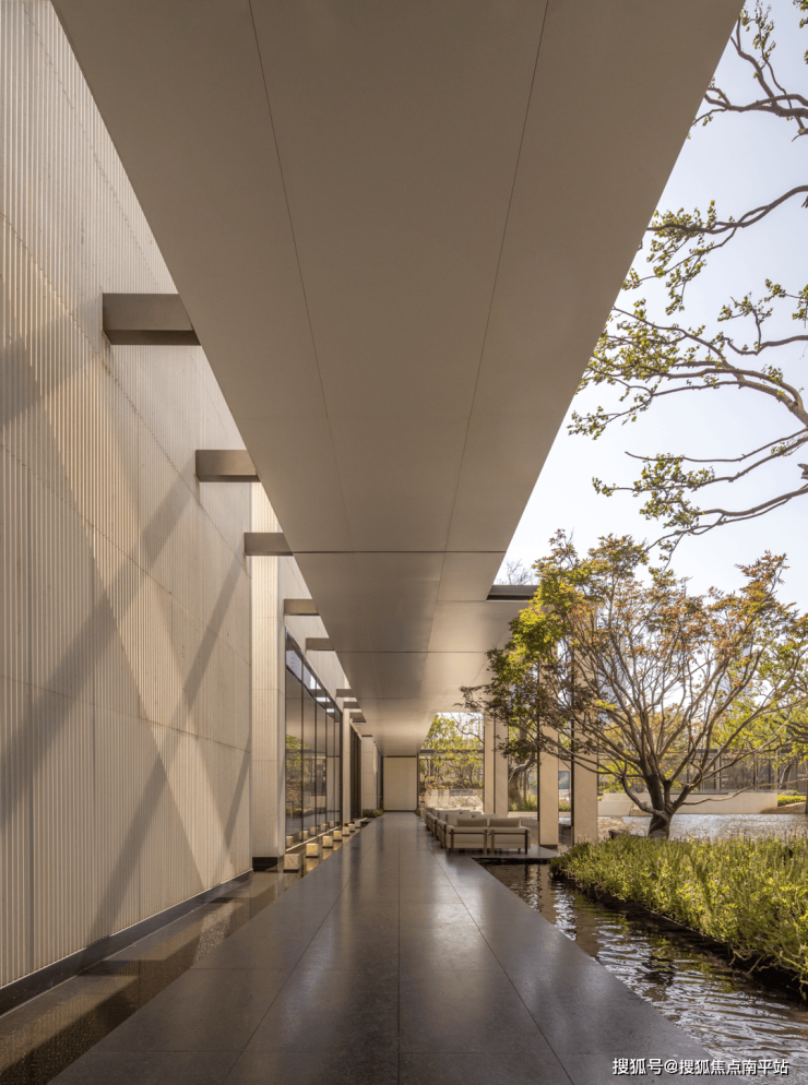 穿过会所,便达中心水院。连廊的进退、水面的镜影、墙的肌理与地面的纹路,以线性韵律将空间串联成诗。归家动线不再仅是路径,而是步移景异的视觉叙事。