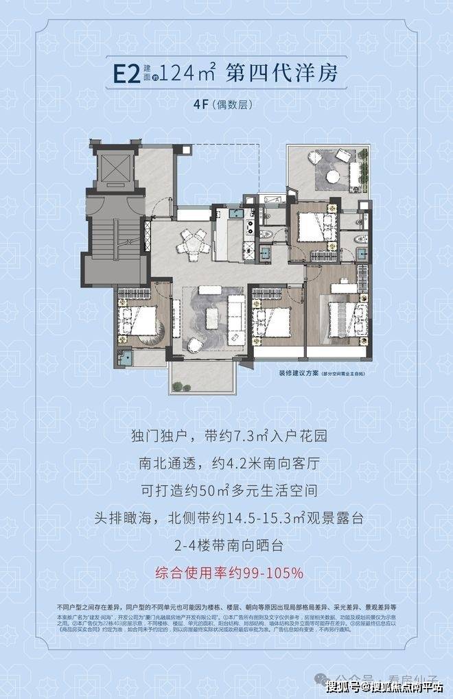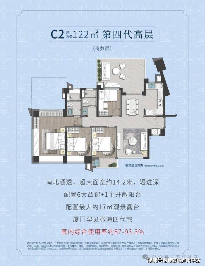 建发阅海规划了2栋高层、7栋洋房、容积率约2.08低密改善住区,楼间距约28米-54.6米,第四代住宅前沿理念将庭院搬至空中,首献89-125㎡厦门瞰海第四代洋房住区(120㎡以上户型)