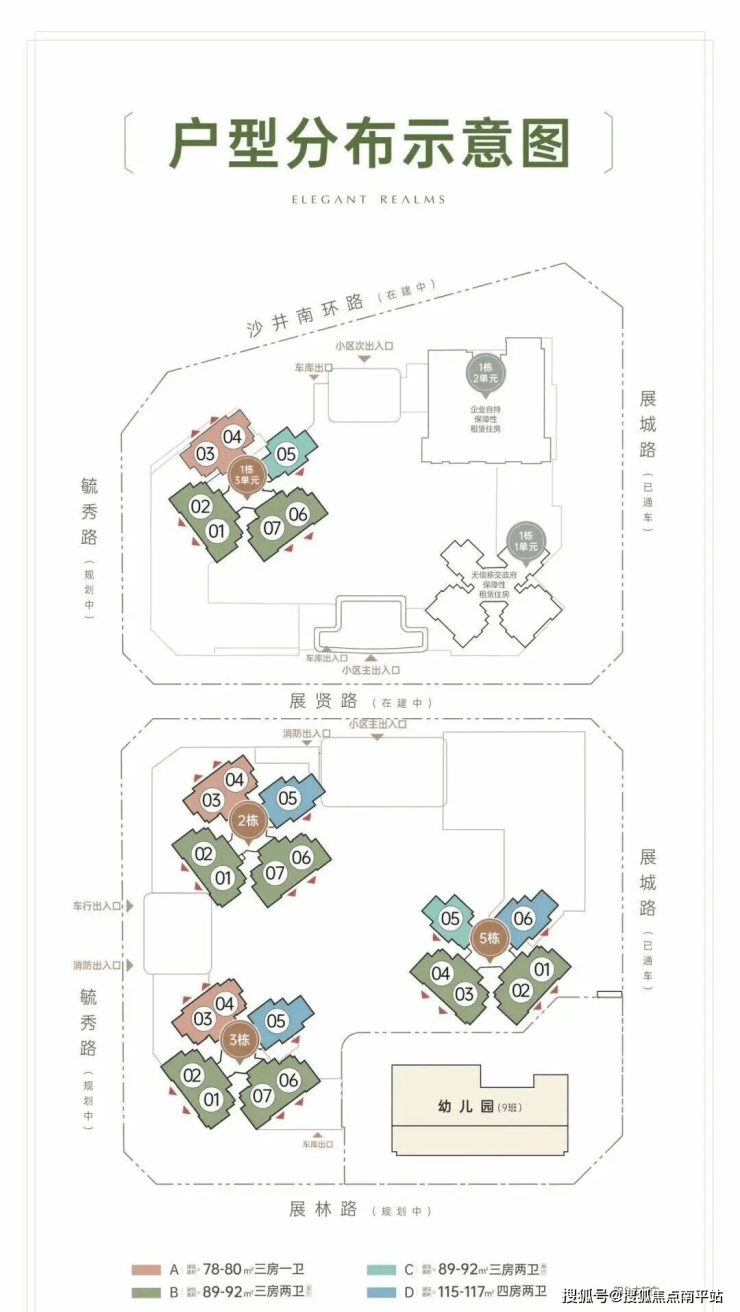 住宅面积53495㎡,规划总户数601户(其中套内建面>90㎡89户,<90㎡的512户)。2、3、5栋为纯住宅,总高31-32层,4栋为1所4层2970㎡幼儿园,容积率4.3。