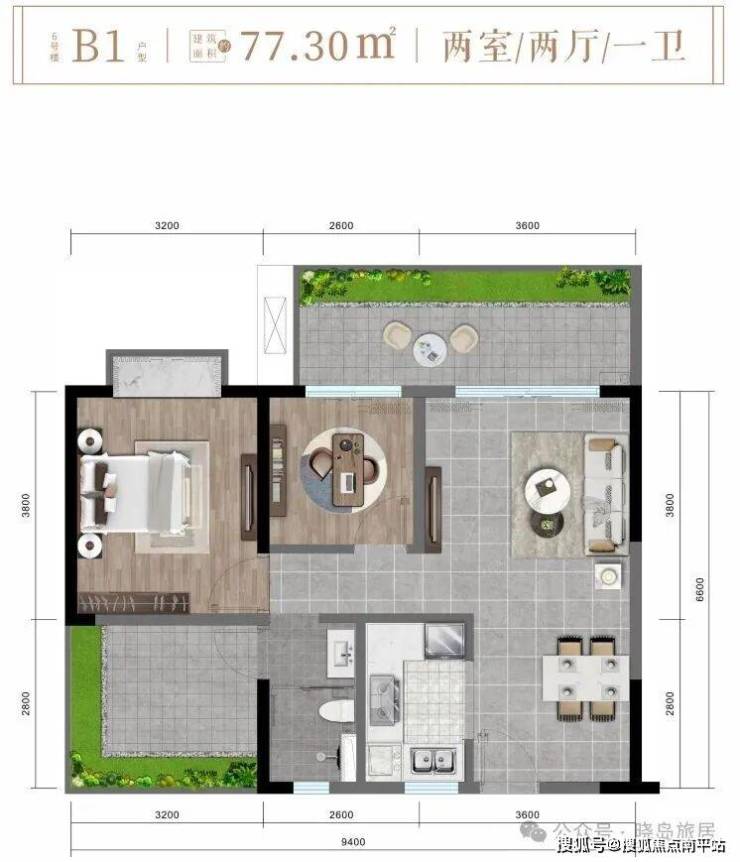 B1户型约77㎡舒适两房两厅一卫