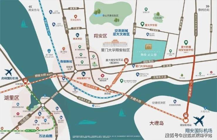 厦门第二东大道——翔安大桥(在建), 便捷畅达翔安隧,纵横岛内外生活主场,翔安国际机场(建设中)、厦门东站(规划中);毗邻机场快速路,约10分钟抵达翔安机场(距离仅7.6公里)地铁3号线支线(规划中)等,形成“海陆空”立体交通网,尽享城芯繁华