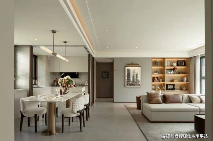 中建悦湖·璟麟的明星107户型,以入户对景玄关礼序,铺陈归家的仪式感。 约5.8米开阔宽厅作为家庭核心社交场域,盛载全家的互动与欢聚。