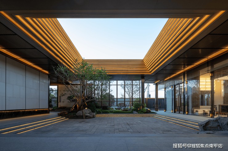 建筑立面创新融合“双飞檐塔冠与钻感天幕”,顶部6米挑高飞檐以铝合金仿木工艺精铸,搭配60%高窗墙比的LOW-E玻璃幕墙。