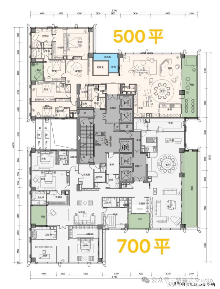 超高区(58 层起,200 米 +):500–700㎡ 顶级大平层