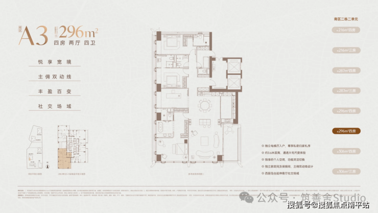 216㎡四房两厅三卫:入门顶豪,四房功能齐全,无保姆间,适合精英家庭;客厅 + 东向大阳台联动,阳台进深约 2.4 米;92%+ 实用率,框架核心筒无次梁,可微调布局。
