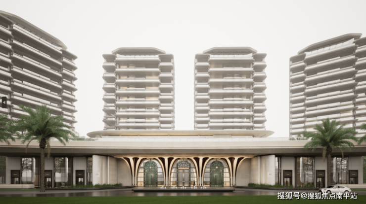 社区入口设计融合海洋元素的流体美学与几何美学,采用八根花柱造型;柱跨间为南洋风格艺术拼花彩玻,搭配奢石装饰门套、VI纹饰把手等细节,形成“八柱六门”入口空间;入口大门尺寸为12米高、90米宽。