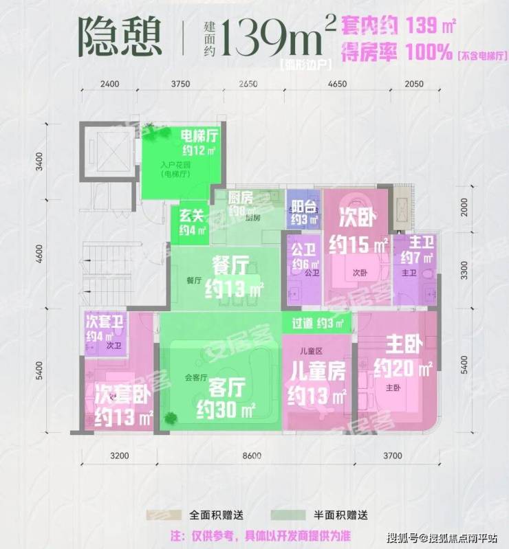 4房3卫,4开间朝南,独立电梯厅入户,双套房设计,但是有一个暗卫。客厅面宽5.3米,打通儿童房客厅拓展面宽8.6米。厨房面积还是有点小,需要与生活阳台打通,生活晾晒区需要合理规划与次卧的空间。139的边户户型,主卧转角窗户以及主卫的窗户设计,很有亮点。