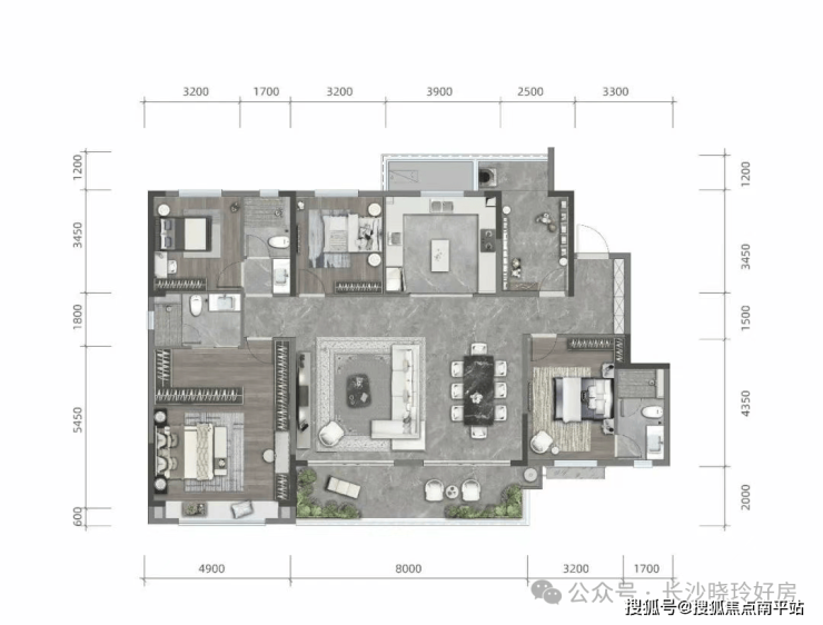 4+1房设计,大横厅开间约8米,如此尺度在别墅和洋房里非常少见!约17.8m南向超大面宽!约16㎡跑道式阳台!市场罕有3套房设计,南向主卧套房开间近5米,带独立的全房式衣帽间!