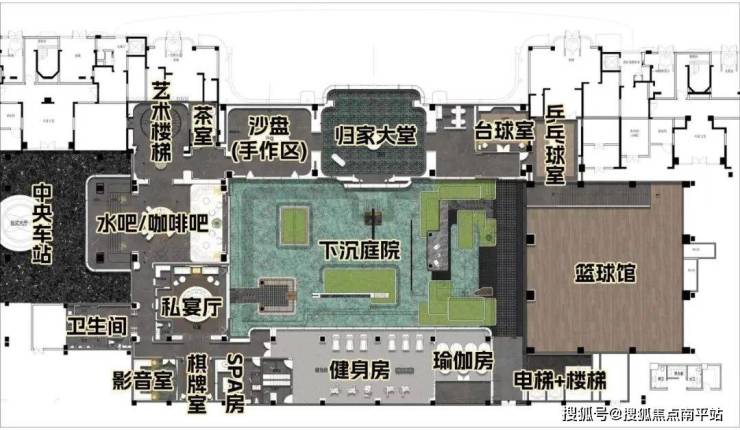 围绕着中央下沉庭院,金茂居然预设了12个功能区。除了常见的健身房、瑜伽室、棋牌室、水吧会客区、茶室,还有私宴厅、观影室、SPA房、台球室、乒乓球房,甚至篮球馆。