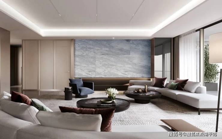 不仅厨房如此,客厅的用材也是诚意十足:土耳其进口的地面石材、巴西进口的奢石背景墙、意大利进口的蓝金沙奢石玄关对景,还有皮革墙面……气质拿捏十分到位。