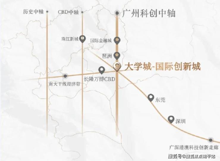 项目位于 大学城二期-国际创新城板块 ,国际创新城共十平方公里,有暨南大学和广州医学院,整个创新城包括北翼的 生物岛 ,核心的大学城和南翼的南岸起步区,南村地区, 化龙地区 ,国际展贸城,在空间结构上形成了一核两翼。