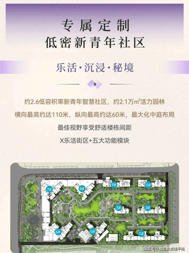 项目容积率约2.6,规划约2.1万㎡活力园林,楼间距较大(横向最高约110米,纵向最高约60米),最大化中庭布局。