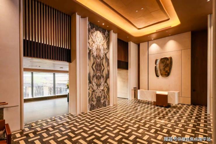 门楼大面积选用高端石材贝金米黄,常作为奢华酒店室内装饰材料;大门腰线饰以非洲蓝翡翠奢石,由原产地非洲马达加斯加进口,因其独特的颜色和稀有性,常被用于高端品牌珠宝设计中;大门中央是非遗工艺纯手工锻打的仿紫铜照壁,融合东方意境与现代美学;落客区透光云石吊顶与定制紫铜大门,铭刻归家专属仪式感。