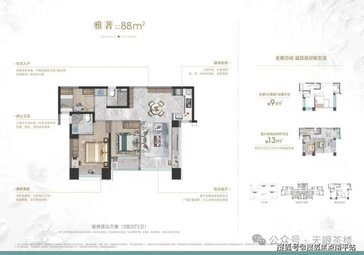 88平3房2卫,5开间采光,全卧室朝南,超强收纳,三段式干湿分离公卫,270°L型全景采光客厅。 99平3房2卫边套,南北通透, 拥享北侧市民公园景观, 综合使用率约87%,不输蝶楼得房率,但隐私感更强, 相当于传统115平的空间使用感。