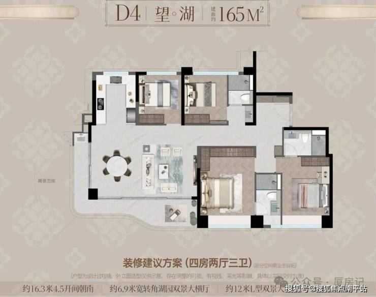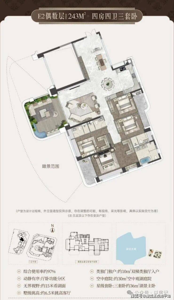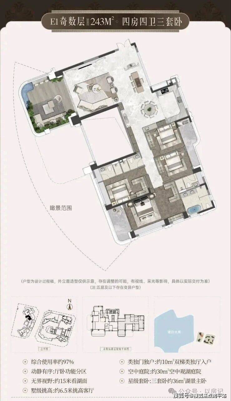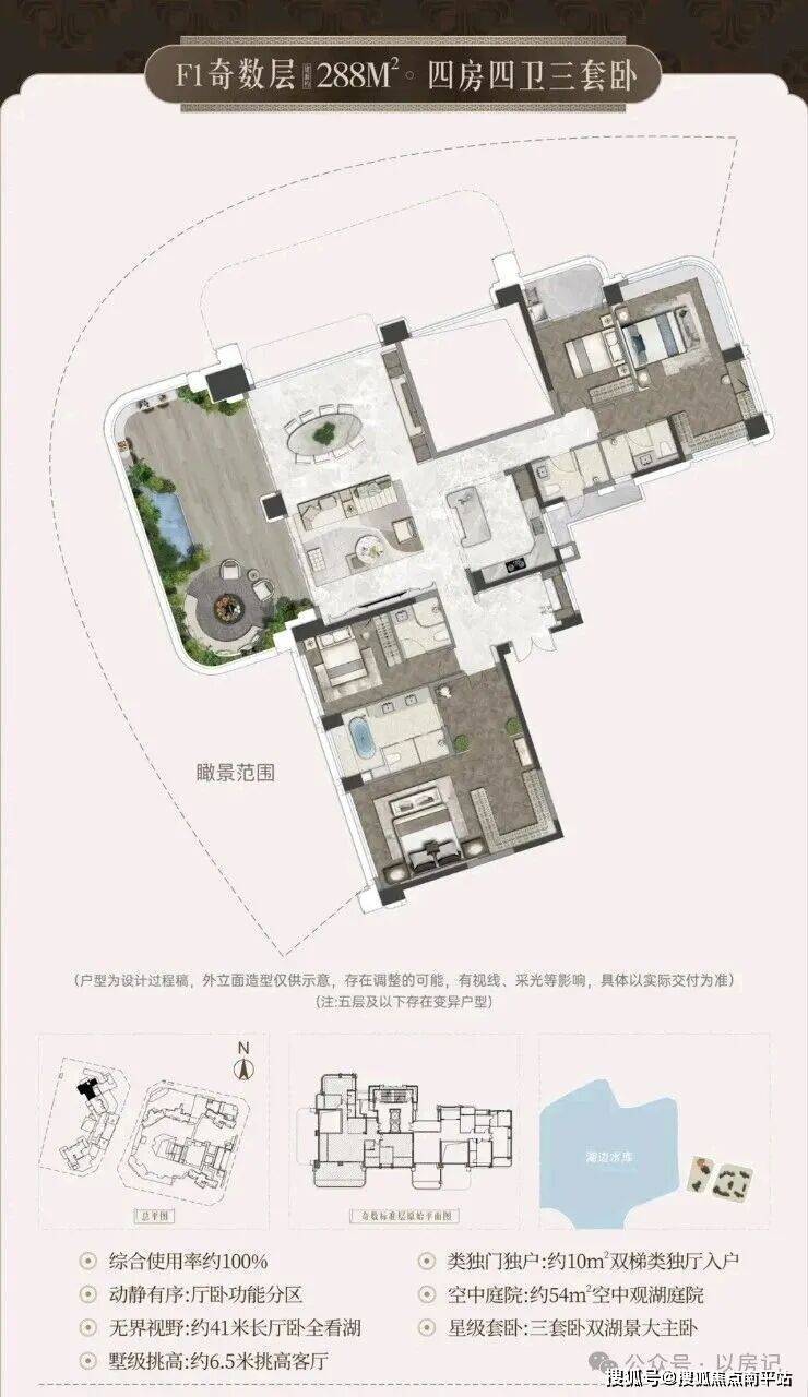 •宸启瑞湖主力户型有 244平 289平 366平等4室布局;
