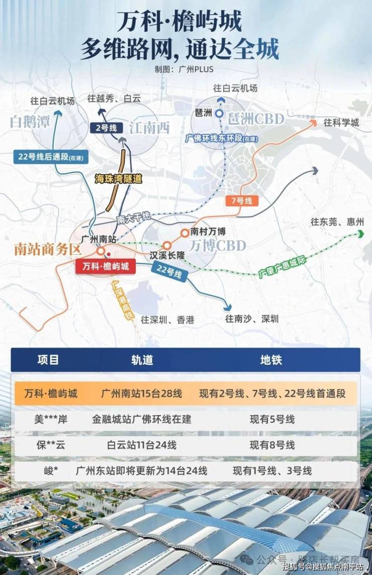 项目汇聚3条地铁线路(2号线、7号线、22号线),实现4站到海珠、4站抵万博、6站达珠江新城的便捷通勤。22号线后通段开通后,更将实现5站直达白鹅潭CBD。