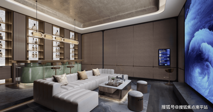 流动水景/变幻光影/璀璨星光,进入园区每一步,都是自然的模拟。单元入户为透光星空顶/釉面陶板与潘多拉奢石融合;「劳斯莱斯式」的星空顶设计,一直延伸至地下光厅,石材背景/金属格栅/定制化标识,一同点亮归家的仪式氛围,打造区域内最具代表性的奢华公区。