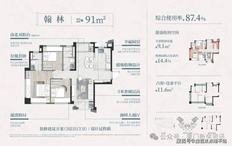 91㎡户型的惊艳之处就在于做了 南北双阳台,而且 综合使用率也是达到了惊人的87.4%,不计产权面积约11.6㎡,居住舒适度直接拉满,在市场中也是一骑绝尘。这个户型同样也是预留户外超长鞋柜空间,除了78㎡该有的精装配置,主卧也是值得称赞, 市面多数90㎡三房产品,卧室空间多是狭小,而书香云锦做到正规三房,而且主卧面积还做到17.2㎡,做到大平层级的居住体验。