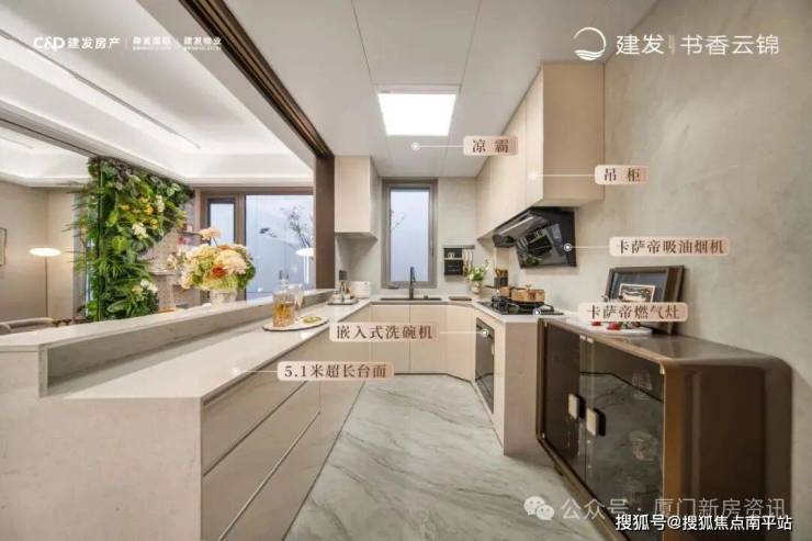 建发·书香云锦高的精装标准,在同区域内同档产品中位列前茅。比如:厨房采用的是建发 幸福厨房理念,在91㎡样板房可以看到,半开放式设计配玻璃隔断,空间大且通透!5.1米超长台面和餐厅移门互动方便。U型布局贴合人体工学,可一条龙操作,大窗户采光通风佳, 比传统110平厨房大,还留了双开门冰箱位,让烹饪成享受。