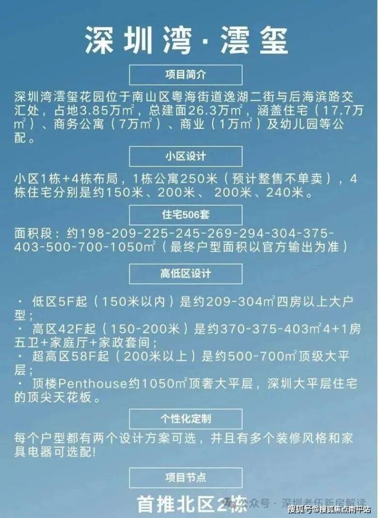 (11月25日),位于南山后海的深圳湾澐玺(项目推广名,项目备案名:后海沄玺花园,以下统称“深圳湾澐玺”)取得预售许可证,为后海片区城市功能配套再添新单元。该项目规划为南北两区开发, 此次率先推出北区房源,户型面积从 209㎡起步,最大顶楼户型达 1180㎡,备案总价从约 3000万起,最高超 3亿元,带装修交付。