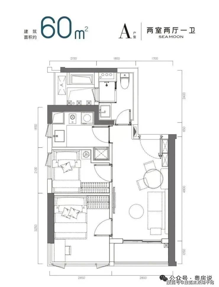 60㎡左右的两房一厅A户型 备案总价约:472-588万