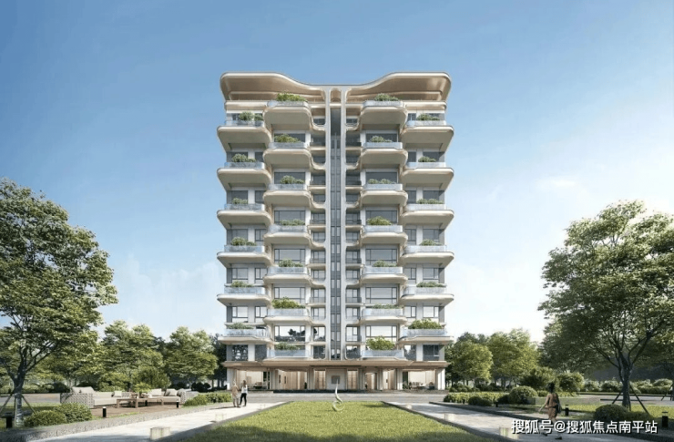 外立面:米黄色大理石+深色大理石+香槟色铝板+通透玻璃幕墙,造型上采用超流体全面屏立面与270°环幕视野飘窗。