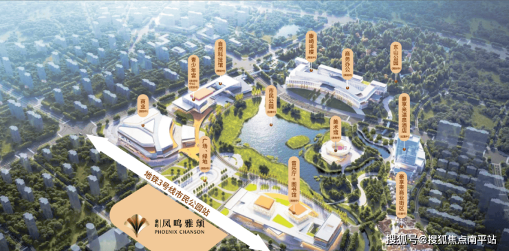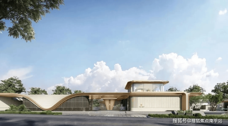 社区大门:以凤凰花为灵感,屋檐使用香槟金铝板,立面采用大理石,尺寸为67米长*7.5米高。
