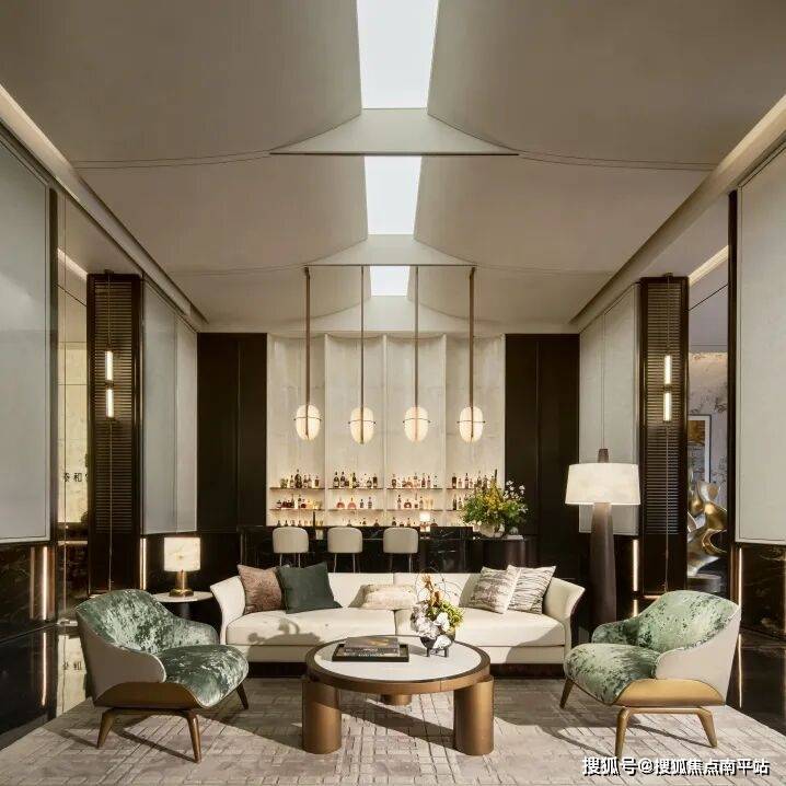 借柜体、屏风强化空间围合感,打造隔绝干扰的私密场域,构建舒适交流圈,搭配金属、大理石质感的边几,柔化材质的冷硬,暖调灯与桌灯交织出温润光影,辅以艺术挂画点缀,既保有隐奢质感,又透出松弛自在的气场。