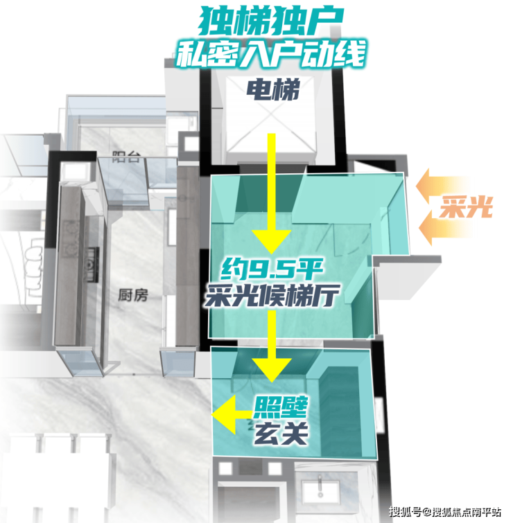 2梯2户设计,两条梯腿楼栋并列分局,电梯位于核心筒中间,业主从电梯出来后,往两个不同方向回家,互不干扰,相当于1梯1户。