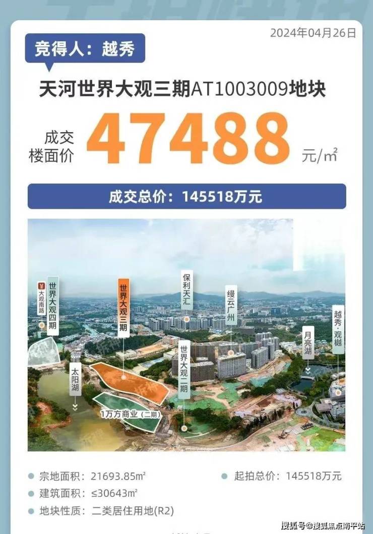 2024年4月,越秀梅开三度,拿下天河世界大观三期地块,折合楼面价47488元/㎡。