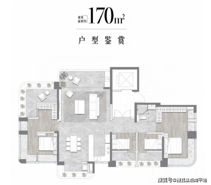168-170㎡四房两厅两卫是主力户型之一,经典竖厅设计,客厅开间 4.2 米,双卫生间配置,能满足三代同堂的居住需求。
