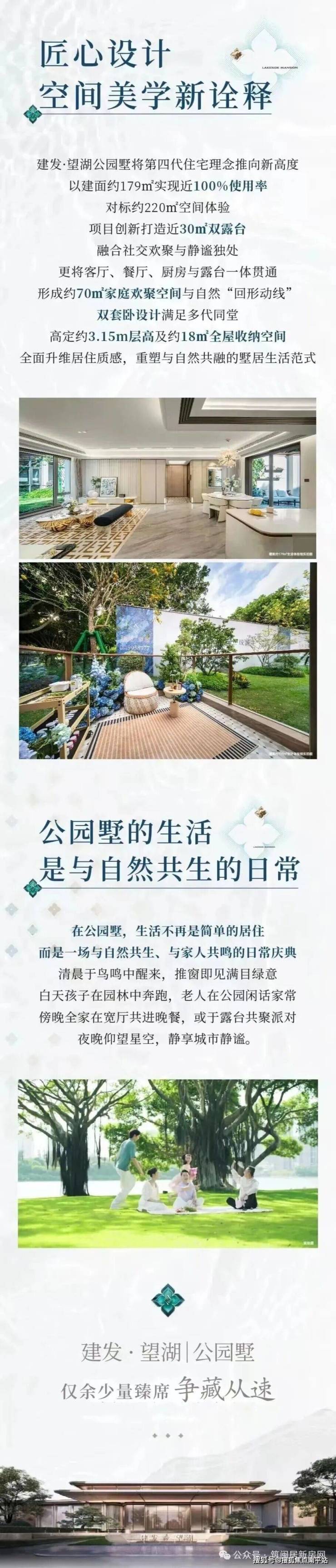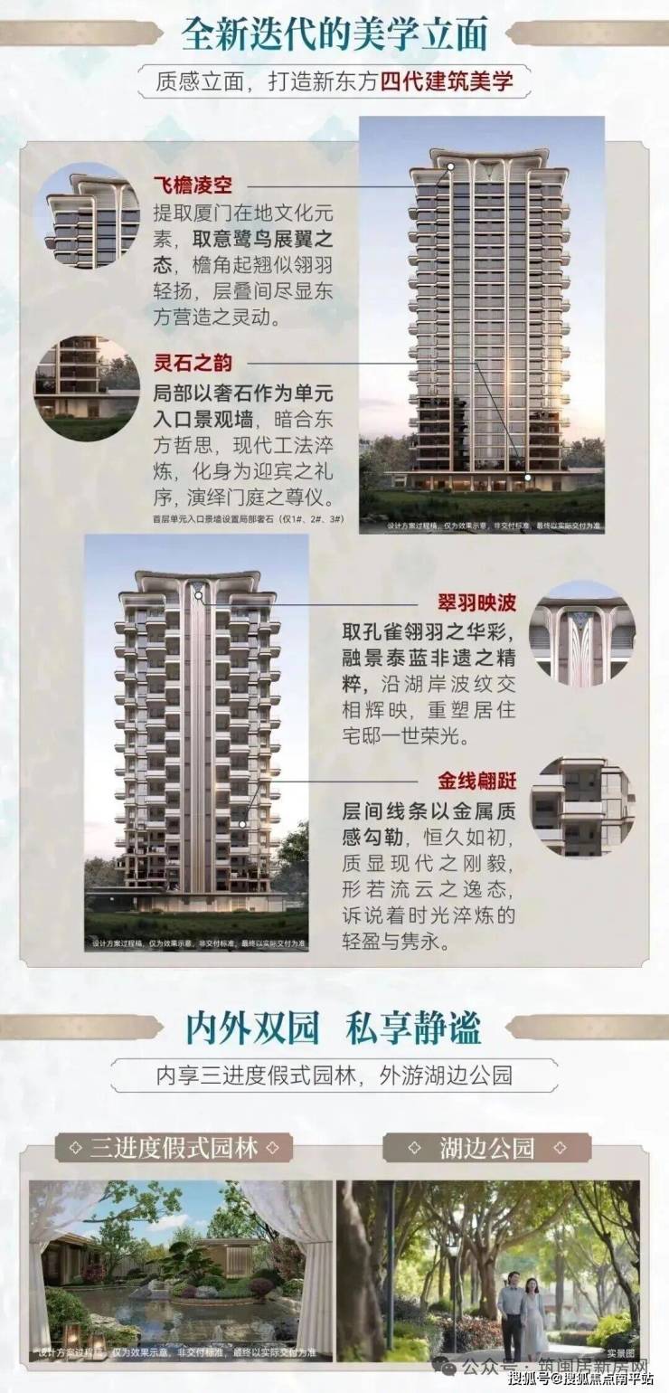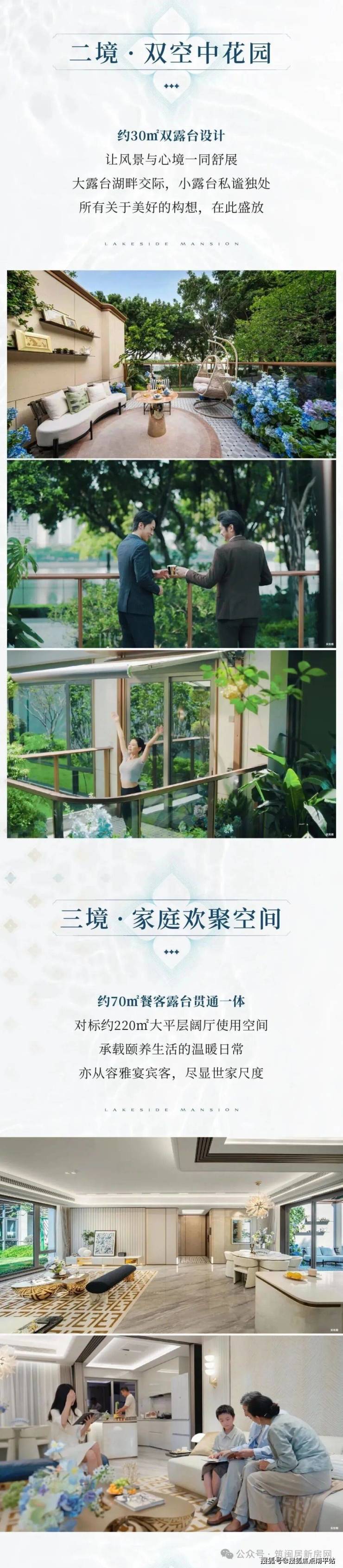 园林设计采用建发招牌的「新中式」风格,打造「一轴三园,五进九景」的园林体系。约1.5万㎡园区内融入亭台水榭、月洞门等传统元素,与外部湖景形成「内园外湖」的双重景观体验。