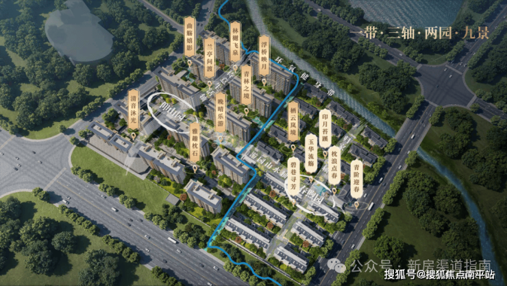 建发瑞湖示范区造凝萃江南灵秀与宋式美学精髓,一草一木皆暗含宋画意境,宛若展开一幅可居可游的 立体《西园雅集图》 。依循宋代造园理法,金山罕有 东西双大门 规制,东西两园分别 以“三进”礼序,营造层层递进, 以 一带两园三轴九景 谱写风雅入画的金山当代诗意生活之典范。