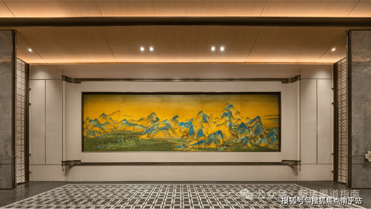 穿越门厅, 九米巨幅《千里江山图》非遗漆画 豁然呈现,天然大漆历经千道工序,再现青绿山河的壮丽磅礴,昭示着“归家,便是走入一幅传世名画”的崇高礼序。