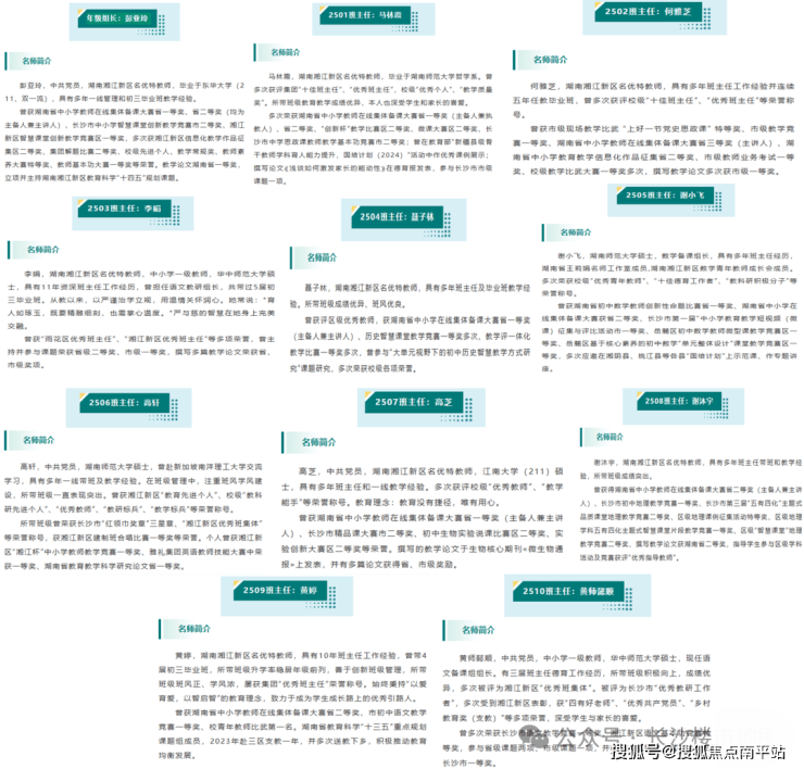 2025届初一年级班主任中,10个班全部由湘江新区名优特教师、一级教师、备课组长担任,教学经验丰富、培养能力突出。
