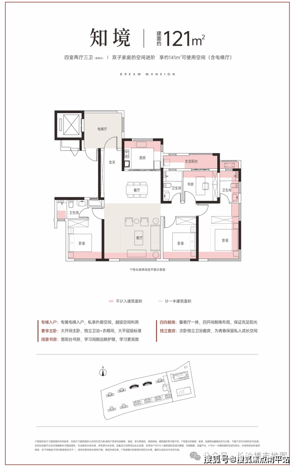 建面约121平户型: 纯板楼+私梯入户,四开间朝南,双套房朝南,可使用空间(含电梯厅)约141m²,得房率约116%,可做四房两厅三卫,相当于以前160平户型。