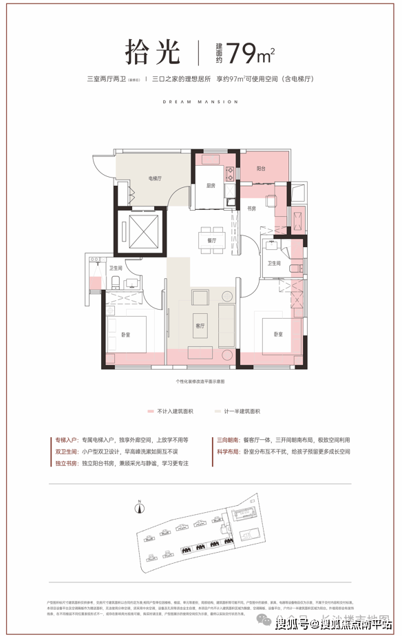 建面约79平户型: 纯板楼小高层+私梯入户,三房两卫设计,可使用空间(含电梯厅)约97m²,得房率约123%,相当于以前的120平户型。