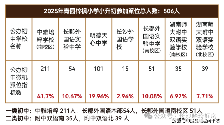 💗 2025年小升初派位中,青园梓枫小学506个,中雅培粹南校区指标占211个(占比41.7%),长郡外国语54个,明德天心101个;