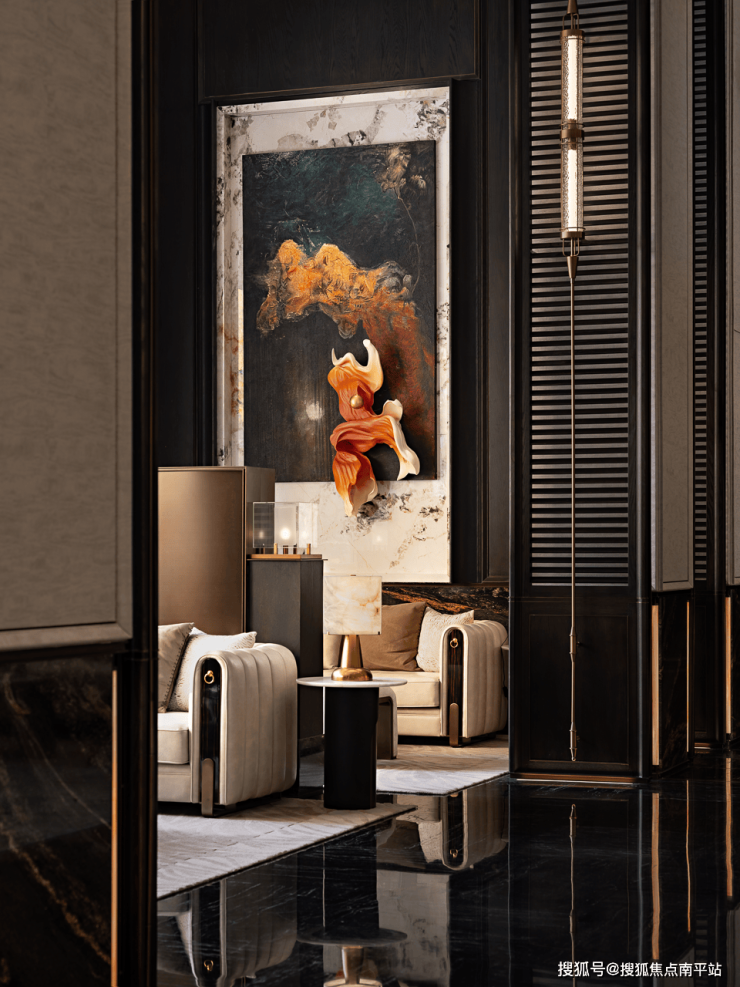 空间转入过厅,这里是一隅“美的停顿”。雕塑以海浪与剪纸意象重构韵律,在现代材质与手工感之间找到平衡。当人在此慢下脚步,空间真正完成一次自然呼吸,让前后情绪得到缓冲。